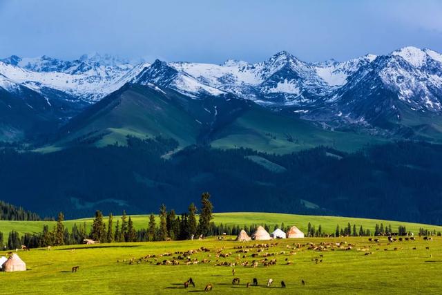 晨曦初升,照耀在天山之巅,银光熠熠,那绵延的雪山,如同巨龙蜿蜒,贯穿东西,守护着这片土地,山脚下,绿洲如翡翠般镶嵌在大地上,河水潺潺,滋润着万物生长,新疆的天空,蔚蓝如洗,白云朵朵,仿佛触手可及。